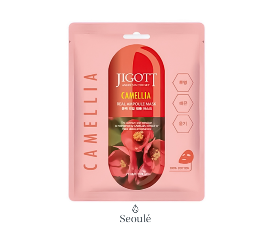 Jigott Camellia Real Ampoule Mask to skoncentrowana ampułka piękna w jednym, niepozornym kawałku materiału. Maska w płachcie, nasączona esencją z wysoko stężonym ekstraktem z kamelii, zapewnia skórze intensywne nawilżenie i odżywienie. Ta bomba cennych substancji sprawia, że cera odzyskuje utracony blask, staje się ekstremalnie gładka i jedwabiście miękka.